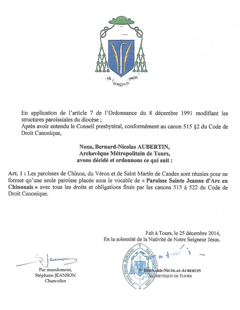 Au 1er janvier 2015, les paroisses de Chinon, du Véron et de Saint Martin de Candes sont réunies pour ne former qu’une seule paroisse placée sous le vocable de « Paroisse Sainte Jeanne d’Arc en Chinonais ».